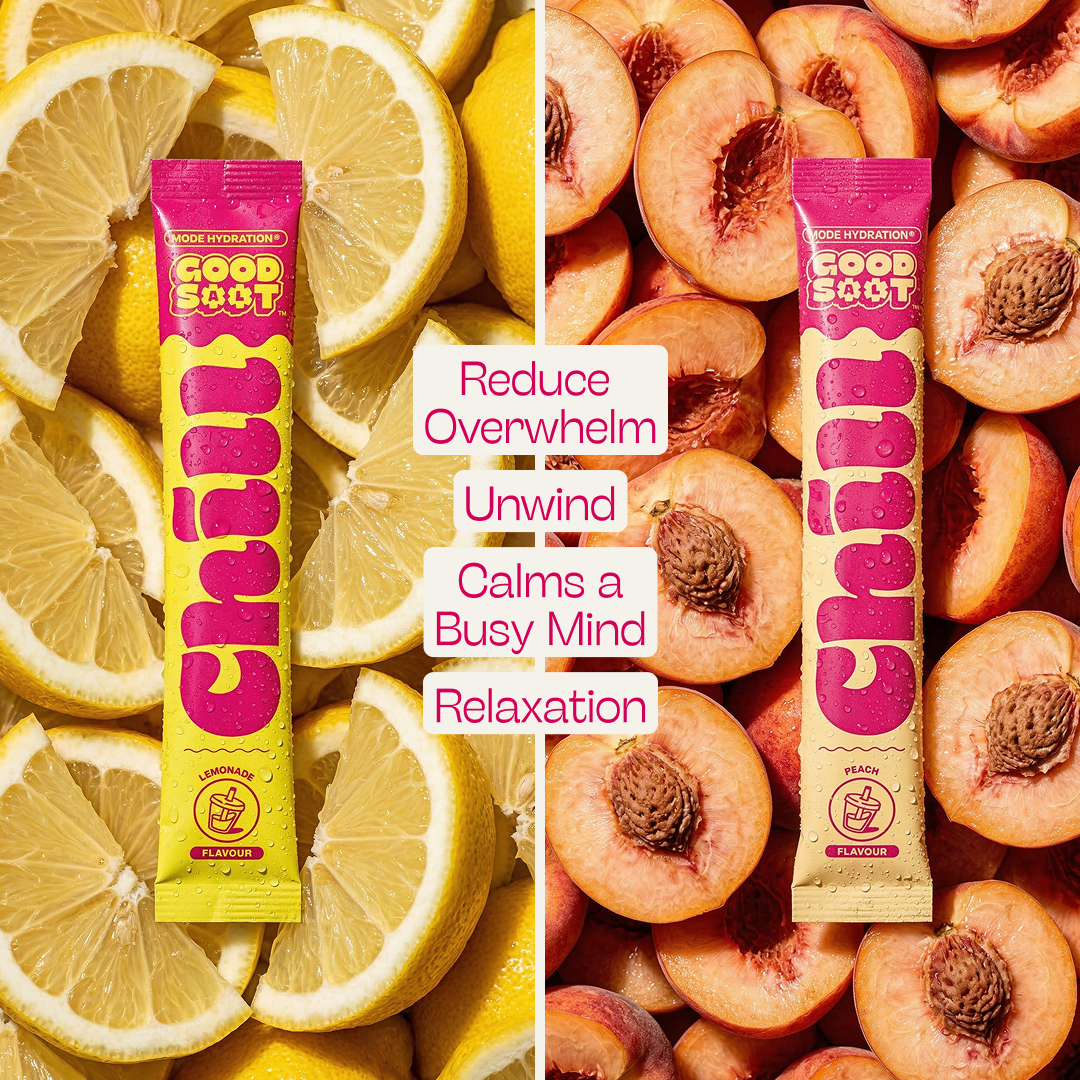 Acid (Malic Acid), Potassium (Potassium Chloride), Natural flavour (Peach), Magnesium (Magnesium Citrate), Salt (Pink Himalayan Salt), Natural colour (Beetroot, Beta Carotene), Anti-caking Agent (Silicon Dioxide), Caffeine Free Green tea Extract (98% L-Theanine) (Camellia sinensis), Lemon Balm 10:1 Extract (Melissa officinalis), Chamomile Flower 10:1 extract (Matricaria chamomilla), Sweetener (Sucralose), Ashwagandha 12:1 Extract (5% Withanolides) (Withania somnifera)